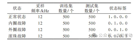 實(shí)驗(yàn)數(shù)據(jù)集采用美國凱斯西儲大學(xué)(CWRU)公開數(shù)據(jù)。CWRU數(shù)據(jù)集是世界公認(rèn)的故障診斷標(biāo)準(zhǔn)數(shù)據(jù)集,截至2015年,僅僅機(jī)械故障診斷領(lǐng)域頂級期刊就發(fā)表過41篇CWRU數(shù)據(jù)診斷的文章。因此本文的實(shí)驗(yàn)數(shù)據(jù)也采用該公開數(shù)據(jù)集。文章選取電機(jī)轉(zhuǎn)速在1797r/min下的4種狀態(tài)數(shù)據(jù),包括正常數(shù)據(jù)、內(nèi)圈故障、外圈故障、滾動體損傷。為了保證數(shù)據(jù)的充分性,針對每一種狀態(tài),共選取了1000個樣本,其中訓(xùn)練樣本和測試樣本的比例為1∶1,對應(yīng)的數(shù)據(jù)集描述如表1所示。 表1 實(shí)驗(yàn)數(shù)據(jù)集描述