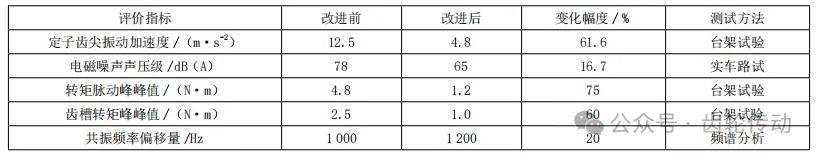 測試結果:利用上述評價方式,對相關指標數據進行分析,本文的驅動電機NVH性能參數改進效果如表2所示。基于參數對比結果可以看出,斜槽設計能夠顯著分散電磁力諧波,降低定子振動幅值,同時有效提升轉子動平衡等級。應用納米晶和約束阻尼材料,能夠有效降低鐵芯鐵損,減弱振動傳遞。優化主動控制系統響應時間,也能有效降低車內噪聲水平。由此可見,系統性改進可有效提升新能源汽車驅動電機NVH整體性能。