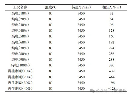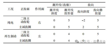 在完成齒軸系統Romax建模后,結合電機峰值扭矩以及整車使用工況進行修形載荷譜確定,可將車輛工況分為純電工況及再生制動工況,載荷譜見表2。在純電工況中,根據電機參數,電機峰值扭矩為320N·m,最小扭矩為32N·m,以電機峰值扭矩的10%為步長逐步遞增至電機峰值扭矩。再生制動車工況:最小扭矩為32N·m,以電機峰值扭矩的10%為步長逐步遞增至電機峰值扭矩的40%。