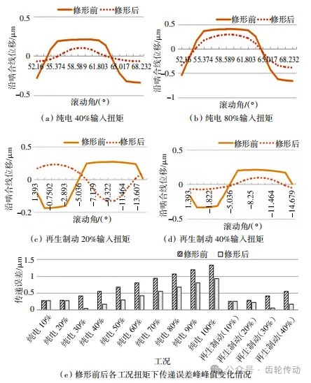 傳遞誤差:圖5(a)~(d)為修形前、后純電40% 、80%工況、再生制動20%、40%工況遞誤差波動情況,從波動曲線可以看出,修形后沿嚙合線方向上的位移有一定的降低,而且波動量有所降低,且曲線變得更加平滑、規律性更加強,齒輪傳動過程中更加平穩。圖5(e)為修形前后各工況扭矩下傳遞誤差峰峰值變化情況,修形前后各工況下傳遞誤差峰峰值均有不同程度的降低,純電30%~80%工況最為顯著,純電30%~80%工況為該減速器的常用工況,見圖5(e)。根據經驗,傳遞誤差≤1μm,該修形方案滿足技術要求,達到預期的效果。