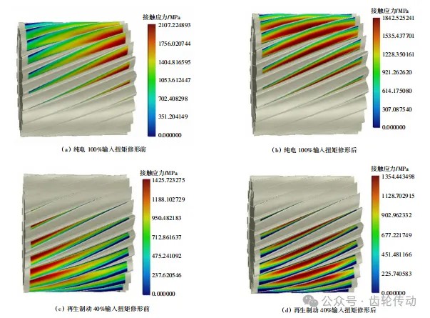 最大接觸應力:圖7(a)、(b)分別為純電100%工況修形前、后齒輪最大接觸應力云圖,修形后齒輪最大接觸應力由2107MPa降低至1842MPa。圖7(c)、(d)分別為再生制動40%工況修形前、后齒輪最大接觸應力云圖,修形后最大接觸應力由1425MPa降低至1354MPa。同樣,由接觸應力云圖可以看出,修形前純電工況、再生制動工況均存在偏載現象。通過修形,齒輪的接觸應力得到了進一步均勻分布,接觸區域向齒面正中央移動,偏載現象基本消除,達到修形目標。