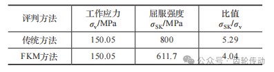 與傳統方法的比較:根據FKM規范的計算原理可知,靜強度的評估準則其實是通過工作應力與允許的靜態應力比值來評判的。進一步分析發現,允許的靜態應力是部件的屈服強度與安全系數的比值。這和常用的評判方法原理是一樣,只是在允許的靜態應力的選取上有所不同。假定安全系數都為1的情況下,兩種方法的計算結果如表5所示。由于傳統方法直接采用試樣的屈服強度,而FKM規范對此進行了一定的修正,故在相同條件下,依據FKM規范的計算結果相比傳統方法更加可靠。