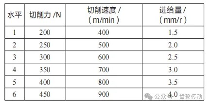 試驗方案與過程:根據上述內容可知,在本次試驗中,以淬硬鋼制成的小型弧齒錐齒輪為切削對象,并采用安裝了粉末冶金高速鋼刀具的數控機床為切削設備,本試驗將采用高速切削工藝進行弧齒錐齒輪硬齒面的切削加工。高速切削工藝是由德國學者薩洛蒙提出的,雖然尚未有確切的概念,但時至今日通常將主軸轉速超過8000r/min的切削加工稱為高速切削。同時,針對不同的加工材料,切削速度各不相同,針對本次試驗選擇的淬硬鋼小型弧齒錐齒輪,當切削速度達到380m/min時就可以稱為高速切削。一般來說,弧齒錐齒輪硬齒面高速切削工藝是一個復雜且系統性的工程,其切削機理仍未完善,所以本文主要探究不同切削工藝參數下弧齒錐齒輪硬齒面的高速切削精度。基于弧齒錐齒輪硬齒面切削加工的實際情況,本次試驗主要以硬齒面的表面質量為試驗指標,其表面質量越高,說明高速切削工藝的精度越高。與此同時,本次試驗選擇了切削力、切削速度及進給量作為切削工藝參數,這些參數是實現弧齒錐齒輪硬齒面高速切削加工的關鍵參數。那么基于上述工藝參數,本文設計的弧齒錐齒輪硬齒面高速切削加工試驗方案如表3所示。