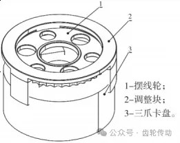 擺線輪的外協最后一道工序為熱處理,粗加工給精加工的端面預留量為0.1mm,由于熱處理后工件會不可避免的發生變形,如果精加工采用直接吸在磨床上進行平磨,會導致工件的形位公差超差,進而影響后續的工序加工。因此,需要設計一套工裝(圖3)來完成此工序的加工。此工裝利用標準的三爪卡盤改造,只需更換特制的卡爪即可,擺線輪在裝夾時,需保證每個卡爪的圓弧面與2個以上的擺線齒接觸。圖中的調整塊可以快速的調整擺線輪裝夾時的平面度,擺線輪夾緊后取掉調整塊進行磨削加工。工裝的夾緊力控制在5N·m,工件在裝夾后幾乎不會發生彎曲變形,可以保證擺線輪在第一面磨削完成松開后,加工面不會發生彎曲變形,磨第二面時便可以將第一面直接吸在磨床平臺上即可,不需要互為基準的多次磨削。要求平磨后擺線輪兩平面的平行度為0.01mm。