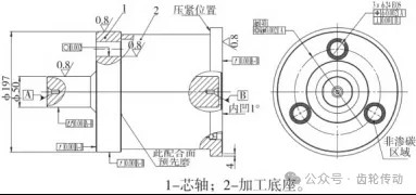 磨齒工裝芯軸的粗加工和熱處理采用外協的方式完成,公司內部只完成芯軸的精加工,芯軸的精加工也是擺線輪工藝裝備中最關鍵的一環。芯軸材質為低碳鋼,熱處理工藝采用滲碳淬火+低溫回火,熱處理后要求表面硬度為58~62HRC,芯部硬度為30~45HRC,滲碳時需要對孔及其周圍的區域(比孔最終尺寸+φ4mm)進行防護,目的是熱處理后需要鏜孔加工的區域的表面硬度與芯軸內部保持一致,精加工時有利于保證加工質量,加工完成后孔周邊的表面硬度還可以滿足工裝的使用。芯軸本體的形狀不便于進行鏜孔加工,因此精加工時還需設計一個芯軸加工底座,來輔助完成芯軸鏜孔時的定位裝夾。芯軸粗加工完成到貨后,先將其中心孔精研,提高定位基準的質量,因后續的工裝加工以及擺線輪加工都是以中心孔為基準。將芯軸與底座的配合面精磨,要求對中心孔的跳動≤0.001mm,然后與底座安裝在一起后進行精加工(圖7)。 圖中的關鍵尺寸按圖所示加工。為了防止芯軸在鏜孔夾緊時發生變形導致加工精度超差,底座底部設計并非是一個大的圓環面,而是設計為半徑方向厚4mm左右的圓環狀,并且要精磨成內凹的形狀。這種設計是為了保證在壓緊時工裝與機床工作臺面為線接觸,這樣芯軸在夾緊后不會發生變形。