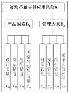 第三級因素選取8個風險因素組成指標層C,第二級因素準則層B包含產品因素和管理2個因素,第一級因素為目標層液漲芯軸夾具應用風險A。
