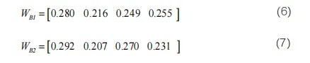 計算得到準則層B各因素的模糊評價矩陣如下: