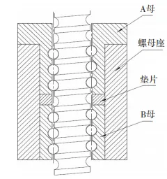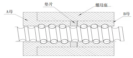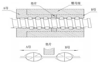 傳統滾珠絲杠副的結構主要由螺母座、A母、B母及墊片組成,如圖1所示,在整個運行過程中A、B母不同時受力,即當螺母向左運行時A母受力,B母不受力,可通過墊片的厚度消除滾珠絲杠副間隙,反之同理可得,采用墊片可實現減小間隙,增強預緊力,保證設備的穩定性。