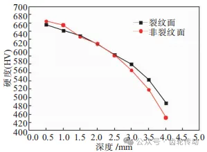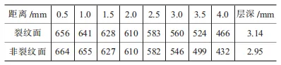 硬度測試:對裂紋面和非裂紋面的表面滲碳層進行深度-硬度測試和對比,結果見表2,滲碳層深度測試見圖5。