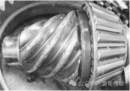 3)由于大扭矩和較高滑移速度,靠近齒根部分先出現(xiàn)膠合及點蝕疲勞帶,減小了齒輪厚度和剛度,大扭矩下小端齒頂應(yīng)力大,導(dǎo)致齒輪倒車面齒頂、源于小端出現(xiàn)打齒。