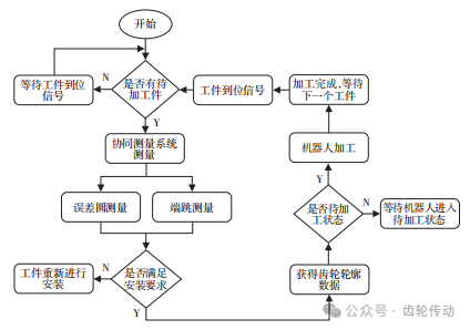 通過測(cè)量的數(shù)據(jù)判斷工件是否滿足安裝的要求,不滿足的工件需要重新進(jìn)行安裝,滿足的條件下,控制系統(tǒng)獲得齒輪輪廓數(shù)據(jù),再判斷機(jī)器人是否處于待加工狀態(tài)。