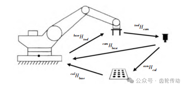 以M19Z35齒輪型號(hào)為例,手眼標(biāo)定就是標(biāo)定相機(jī)坐標(biāo)系和機(jī)器人坐標(biāo)系的位置關(guān)系camHbase,手眼標(biāo)定的工作原理模型,如圖9所示。