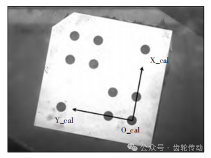 (2)在特制的標(biāo)定板上根據(jù)右手螺旋定則建立標(biāo)定板坐標(biāo)系,如圖10所示。選用特征圓孔的圓心作為特征點(diǎn),獲得在標(biāo)定板坐標(biāo)系中9組特征點(diǎn)的坐標(biāo)數(shù)據(jù)。