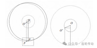 偏心現(xiàn)象誤差模型推導(dǎo):實(shí)際的齒輪倒角加工過程中,齒輪并不是理想的隨著齒輪中心進(jìn)行轉(zhuǎn)動(dòng),而是存在齒輪中心和旋轉(zhuǎn)平臺(tái)中心不重合的現(xiàn)象,也就是偏心現(xiàn)象,偏心現(xiàn)象模型原理圖,如圖13所示。其中,O點(diǎn)表示旋轉(zhuǎn)平臺(tái)的中心,O’點(diǎn)表示實(shí)際齒輪中心的位置。