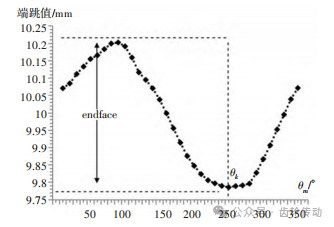 因?yàn)閳D15中ΔOAA’和ΔA’B’B呈相似三角形,從誤差圓數(shù)據(jù)中可以獲得端跳的極值endface,通過端跳數(shù)據(jù)中波谷所在的角度 θk和當(dāng)前旋轉(zhuǎn)平臺(tái)所在的角度θm。