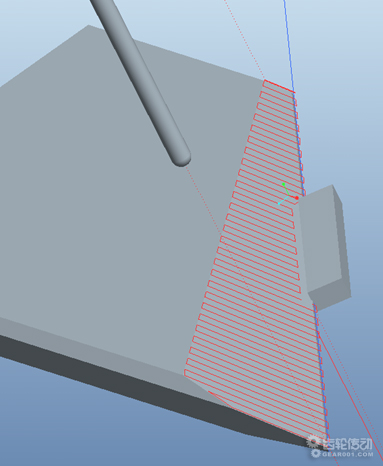 在斜面加工時,若采用圖3.1所示的橫向水平走刀,每一段走刀距離都很短,在切削過程中主軸需要頻繁換向,切削穩定性差。且由于切削的是斜面,水平走刀需要X或Y軸與Z軸的聯動,不利于切削速度的提升。因此,針對此類斜面加工,走刀軌跡盡量安排為平行于最長斜邊(如圖3.2),不但走刀軌跡最長、換向次數最少,而且單道走刀都只是在XY平面運動切削,Z軸方向運動都是安排在工件輪廓之外的位置,即使在高速切削下亦可減小刀具損傷。