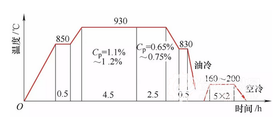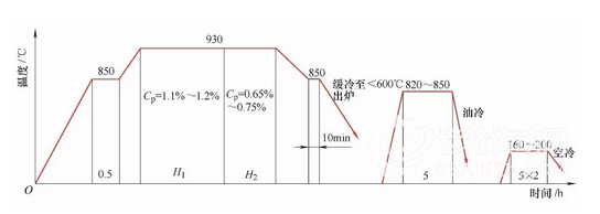 圖2 1818CrNiMo7-6 6模數齒塊滲碳加熱淬火工藝曲線