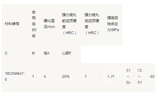 我國強力噴丸工藝在機械行業也是從20世紀80年代起,特別是近二十年隨著汽車制造業的崛起、風電發電工業的發展才得以重視,并帶動噴丸強化用介質、設備和工藝技術的發展。介紹各種強力噴丸的資料不少,但對18CrNiMo7-6鋼不同硬化層深度下,強力噴丸對齒輪性能的影響研究不多。本文就強力噴丸對18CrNiMo7-6鋼不同硬化層深度齒輪的性能影響進行研究,為18CrNiMo7-6鋼齒輪強力噴丸提供工藝試驗依據。