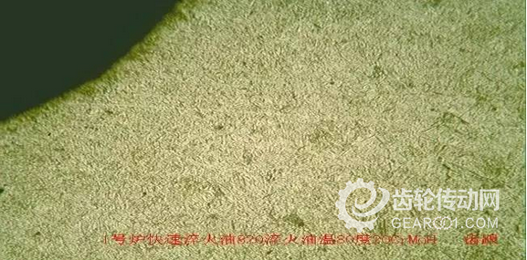 新工藝結(jié)果:心部為板條馬氏體加少量的貝氏體組織如圖12所示;齒面為馬氏體組織如圖13所示,三級;齒頂碳化物1級,為彌散顆粒狀碳化物如圖14所示;齒根為馬氏體組織如圖15所示,三級,心部硬度43HRC,結(jié)果完全符合外商的要求。