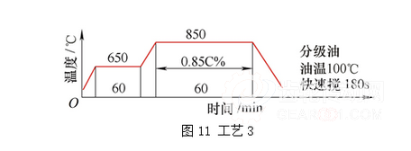 工藝1曲線如圖1所示,使用設(shè)備是天龍生產(chǎn)的多用爐,型號為RM9-75/130/75-5-TL。淬火冷卻介質(zhì)使用北京華立精細(xì)化工公司今禹等溫分級淬火油,型號Y35-Ⅱ。