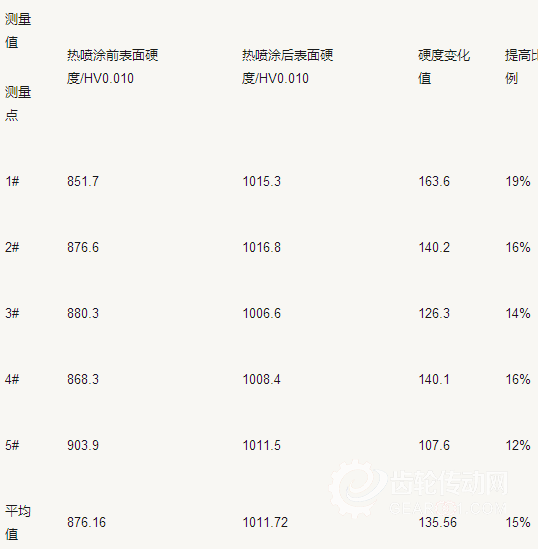 經(jīng)過高能等離子噴涂后,表面顯微硬度有所提升(見表3),雖影響很淺,但能適當(dāng)提升齒面接觸疲勞強(qiáng)度。