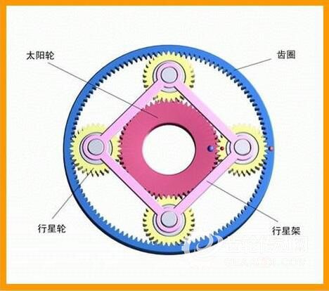 行星齒輪機構由太陽輪(中心輪)、行星齒輪、行星齒輪架(行星架)、齒圈等組成,為軸轉式齒輪系統,與定軸式齒輪系統一樣,也可以實現變速與變矩。它的運轉遵循一個行星齒輪機構運動特性方程: