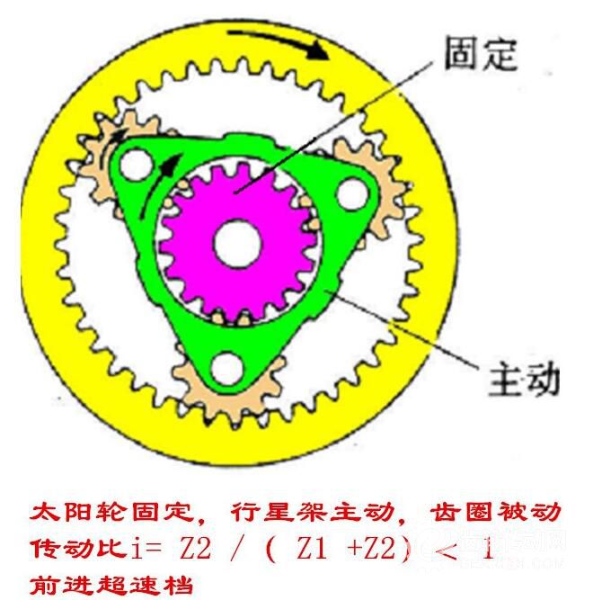此種組合為升速傳動,傳動比一般為0.2~0.4,轉向相同,為前進超速檔。