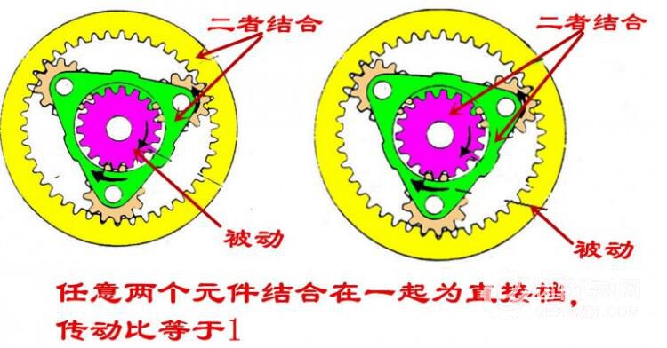 7、把三元件中任意兩元件結合為一體的情況: 當把行星架和齒圈結合為一體作為主動件,太陽輪為被動件或者把太陽輪和行星架結合為一體作為主動件,齒圈作為被動件時,行星齒輪間沒有相對運動,作為一個整體運轉,傳動比為1,轉向相同。汽車上常用此種組合方式組成直接檔。