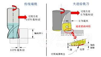 圖 1大進(jìn)給刀具與傳統(tǒng)立銑刀對(duì)比