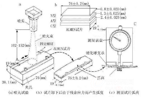 ①阿爾門(ALMEN)弧高值測定法: 目前,國內、外應用最廣的方法是采用美國SAE442A和SAE443標準中規定的阿爾門(ALMEN)弧高值測定法,即使用一定規格的彈簧鋼試片,通過檢測噴丸強化后的形狀變化來反映噴丸效果,具體測量方法見圖1所示。