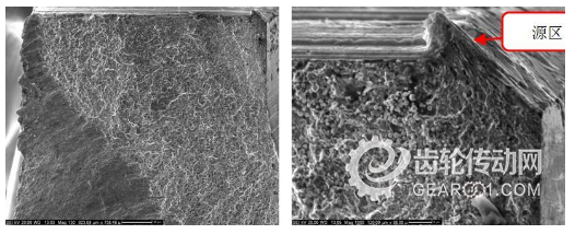 2#、3#裂紋斷口形貌相同。裂紋斷口宏觀較平整、未見明顯塑性變形,源區位于齒根端角(齒根與橫截面相交的端角)表面、小線源特征;齒根與橫截面相交的端角不夠圓滑,且加工面較粗糙,形貌如圖7、圖8所示。裂紋擴展區主要為沿晶形貌,局部為韌窩形貌,如圖9、圖10所示;人為打斷區為韌窩形貌,如圖11所示。