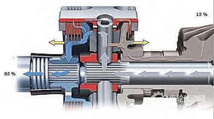 當前軸車輪附著力降低時,冠狀齒輪差速器會將最多85%的扭矩傳遞至后軸。