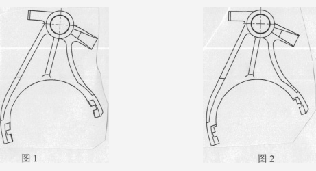 一同開發、研制、生產。我們考慮到本國資源,我國金屬鉬稀少,離子噴鉬撥叉噪音小、耐磨等性能好,但價格昂貴。于是我們協商開發增強尼龍鑲嵌的撥叉。由于我們歷經過一些試驗,有一定的經驗與教訓。小平面撥叉叉口面積小,為保證其強度,我們在原有撥叉毛坯的基礎上,對原有撥叉口加以改進見圖 :