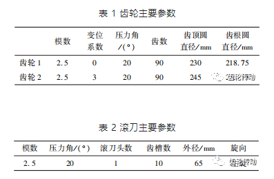 對變位系數為 0 和 3 的兩個齒輪分別進行加工,采用三坐標測量機測量被加工齒輪的齒面誤差,并與齒面誤差的仿真計算結果進行比較。被加工齒輪的主要技術參數如表 1 所示,相應滾刀的主要技術參數如表 2 所示。