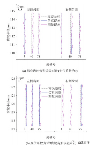 如圖 5a 所示,標準齒輪 40 號齒槽面實測和仿真齒形誤差均整體偏大,各齒槽面仿真與測量齒形誤差值十分相近且吻合較好,實際加工和測量過程中的多種因素使得測量結果略偏大。如圖 5b 所示,大變位齒輪在計算齒寬位置處,1 號和 75 號齒槽面實測和仿真計算齒形誤差均整體偏大,且各齒槽面仿真結果與測量結果的誤差形態也吻合較好。