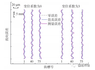 齒向誤差比較:圖 6 所示為右側齒槽面齒向誤差仿真與實測結果比較。圖中描述了第 1 號、40 號和 75 號齒槽面齒向誤差,仿真與測量結果均呈現出明顯波浪形狀,誤差形態十分相近并吻合較好。各齒向誤差均在同一半徑處,對齒寬參數按要求取值進行仿真計算和測量。齒槽左側齒面齒向誤差與圖 6 所示相近。