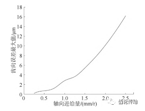 齒向誤差驗證分析:圖 11 所示為齒向誤差最大值與滾刀軸向進給量的關系曲線。