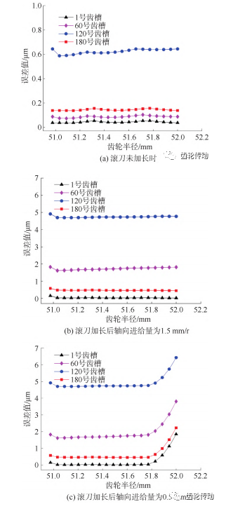 由圖 12a 和圖 13a 可看出,滾刀未加長時各齒槽左、右齒面齒形誤差靠近輪齒齒頂處均明顯增大。