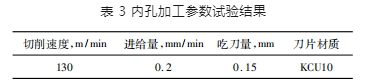 (2) 采用 φ140 減振車(chē)刀桿進(jìn)行精加工,對(duì)精加工末序進(jìn)刀量進(jìn)行控制,通過(guò)試驗(yàn)觀察切屑狀態(tài),如出現(xiàn)混亂屑及斷屑不良應(yīng)及時(shí)調(diào)整切屑參數(shù),從而保證減振刀桿加工效果,每側(cè)加工長(zhǎng)度要大于 L /2。內(nèi)孔加工參數(shù)試驗(yàn)結(jié)果見(jiàn)表 3。