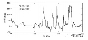 根據實車采集的轉速作為永磁同步電機動態仿真模型的輸入計算得到仿真轉矩,并將仿真得到的轉矩與實測得到的轉矩進行對比,對比圖如圖4所示。