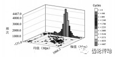 循環計數:雨流計數主要針對連續載荷歷程進行載荷循環計數,然 而在齒輪旋轉過程中,兩個齒輪始終處于嚙合狀態,但是對于單個齒卻處于分離、嚙合、分離、嚙合的狀態。換言之,單個齒上的載荷是非連續的,這也意味著齒載荷為脈動循環載荷,即單齒所受到的應力是從0到最大再到0的過程,單個齒上的載荷是非連續的,因此齒載荷不能使用傳統的雨流計數法進行計數。鑒于齒輪在工作中的實際情況,本文采用旋轉雨流計數法對齒輪進行循環計數,計數結果如圖6所示。