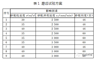 磨齒試驗方案:根據(jù)實際加工情況,本次試驗的影響因素設(shè)置如下:砂輪線速度v 分別取30m/s、35m/s、40m/s;砂輪沖程速度vf 分別取2500mm/min、3000mm/min、 3500mm/min;砂輪粒度分別取46目、60目、80目。對3個影響因素進行試驗設(shè)計,試驗方案見表1。