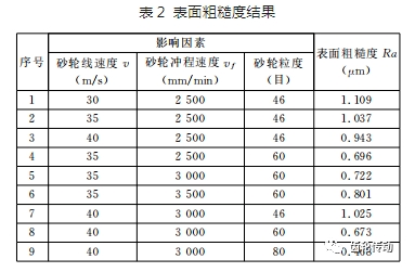 從表2可以看出:當砂輪粒度和砂輪沖程速度一定時,砂輪線速度v越高,齒面粗糙度值越低,齒面越光滑,這是由于砂輪是由一個個大小基本相同的磨粒粘結(jié)而成的,每個磨粒可被看作一個切削刃,砂輪線速度低,單位時間內(nèi)參與磨削的磨粒少,切削刃數(shù)量少,單個切削刃吃刀量大,塑性變形嚴重,零件表面會由于塑性變形產(chǎn)生溝槽,表面粗糙度差,當砂輪線速度提高時,單位時間內(nèi)參與磨削的磨粒增多,切削刃數(shù)量增多,單個切削刃吃刀量減小,塑性變形減小,零件表面形成的溝槽深度較小,表面粗糙度變小,但砂輪線速度也不能無限增大,過大的砂輪線速度會使磨削表面產(chǎn)生大量的磨削熱,有可能導致磨削表面燒傷甚至產(chǎn)生磨削裂紋;當砂輪線速度和砂輪粒度一定時,砂輪沖程速度越低,齒面粗糙度值越低,齒面越光滑,這是由于砂輪沖程速度增大后,單位時間內(nèi)通過被磨表面的磨粒減少,每個切削刃磨削的范圍變大,磨削力增大,從而加大塑性變形,齒面粗糙度變差,提高砂輪沖程速度在一方面會提高磨削效率,減少磨削時間,另一方面則會加快砂輪磨損,影響零件表面粗糙度,因此在實際生產(chǎn)時需要綜合考慮;當砂輪線速度和砂輪沖程速度一定時,砂輪粒度越高,齒面粗糙度值越低,齒面越光滑,砂輪粒度表明了砂輪磨粒的大小,砂輪粒度越高說明砂輪磨粒越小,單位面積上的磨粒越多,參與磨削的切削刃數(shù)量越多,每個切削刃切削厚度越小,表面粗糙度好,但砂輪粒度越高,越容易發(fā)生堵塞,導致磨削熱量不能及時被冷卻液帶走,易發(fā)生磨削燒傷。