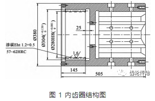 ( 2) 內齒圈齒面需滲碳淬火處理,滲碳層硬度 57 ~ 62HRC,精加工后有效硬化層深 1.2 ~ 1.7 mm。