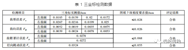 加工完成的內齒圈通過三坐標計量齒形、齒向、齒距和徑向跳動誤差,精度完全達到圖紙要求的 7 級精度,三坐標齒形檢測數據見表 1。