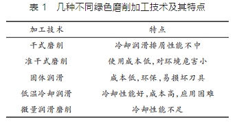 要貫徹“綠色磨削加工技術”這一理念,需要從加工過程中使用的磨削液入手。幾種不同綠色磨削加工技術及其特點見表 1。這幾種綠色磨削加工技術使用的磨削液并不是傳統意義上的磨削液,而是可替代傳統磨削液并能達到與其相同效果的壓縮氣體、固體潤滑劑、低溫氣體等其他形式的介質。