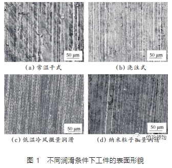NMQL 的冷卻和潤滑能力優異,國內外很多研究人員對 NMQL 的基礎理論進行了研究。同時,為了探明 NMQL 中納米粒子的減磨和抗磨原理,進行了大量的研究和計算工作,取得了 NMQL 納米粒子抗磨減磨的階段性成果。NMQL 的工件質量好,且發生“黏附”的概率小。不同潤滑條件下工件的表面形貌如圖 1 所示。