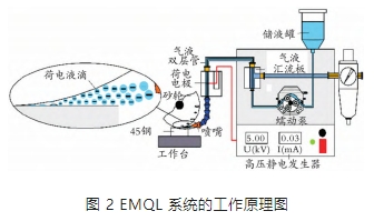相較于普通 MQL 使用的磨削液,ES 使用的磨削液液滴更小且分布更均勻;由于液滴帶電,能夠更好地吸附在工件表面并磨削核心區域,因此更好地發揮潤滑與冷卻的作用。此外,在靜電噴霧微量潤滑加工過程中,磨削液滴在工件和機床內壁的沉積增加,降低磨削環境中的油霧濃度。EMQL 系統的工作原理圖如圖 2 所示。