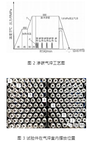 齒輪滲碳氣淬工藝如圖 2 所示,采用 930 ℃ 滲碳后 1.8 MPa 高壓氣淬。在氣淬室內工件整體采用 9 層裝料方式,每層共兩個裝料盤,總共裝 18 個料盤; 每料盤裝 65 個齒輪,共計 1170 個齒輪件,為具體分析每層工件的氣淬均勻性,試驗件擺放位置如圖 3 所示。