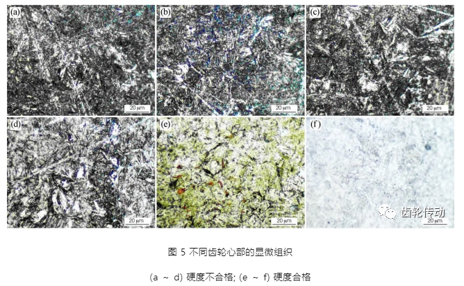 根據檢測結果可知,位置 1 和位置 2 的全部工件心部硬度遠高于工藝要求值; 位置 3 與位置 4 第 1 層至第 3 層的心部硬度最低值在380 HV10 以上,也符合工藝要求,但其第 4 ~ 9 層齒輪件的心部硬度值較低,處于最低工藝要求硬度值附近。圖 5 是齒輪心部硬度合格與不合格的金相照片。可以看出,硬度合格的齒輪心部組織為馬氏體與貝氏體,而硬度不合格的齒輪心部組織除了馬氏體和貝氏體還分布了大量鐵素體。根據 GB /T 38805—2020《重載齒輪熱處理技術要求》,汽車齒輪心部組織可以存在少量貝氏體,但不能存在游離鐵素體。